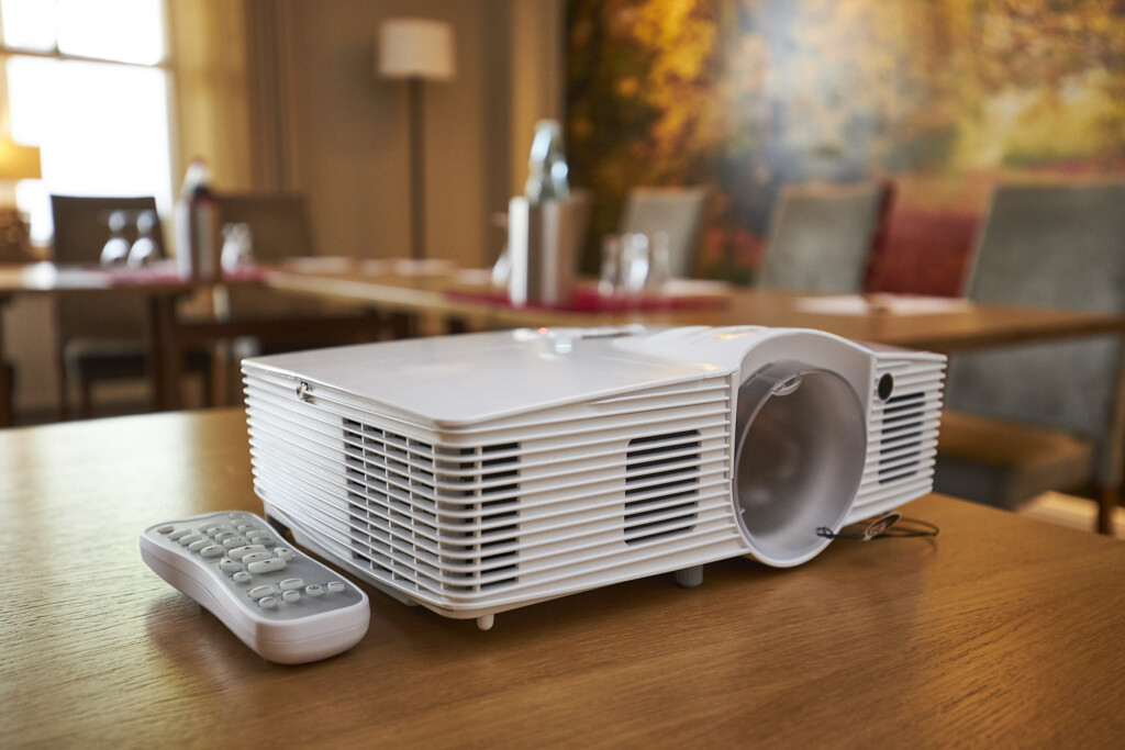 moderne Tagungstechnik (Beamer, Flip-Chart, Pinnwand, Leinwand, Whiteboard, Moderatorenkoffer, Konferenzmikrofon, TV-Gerät)