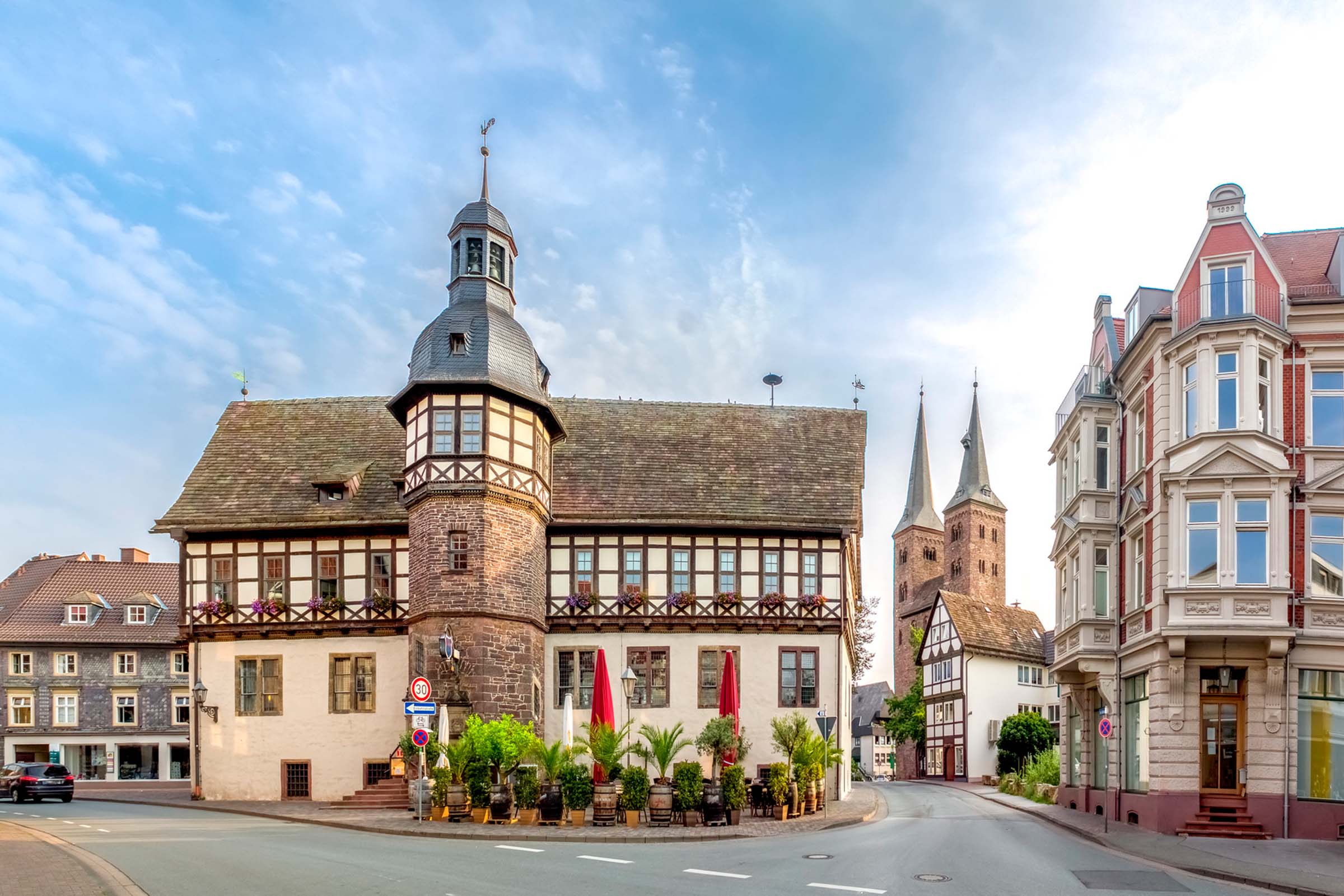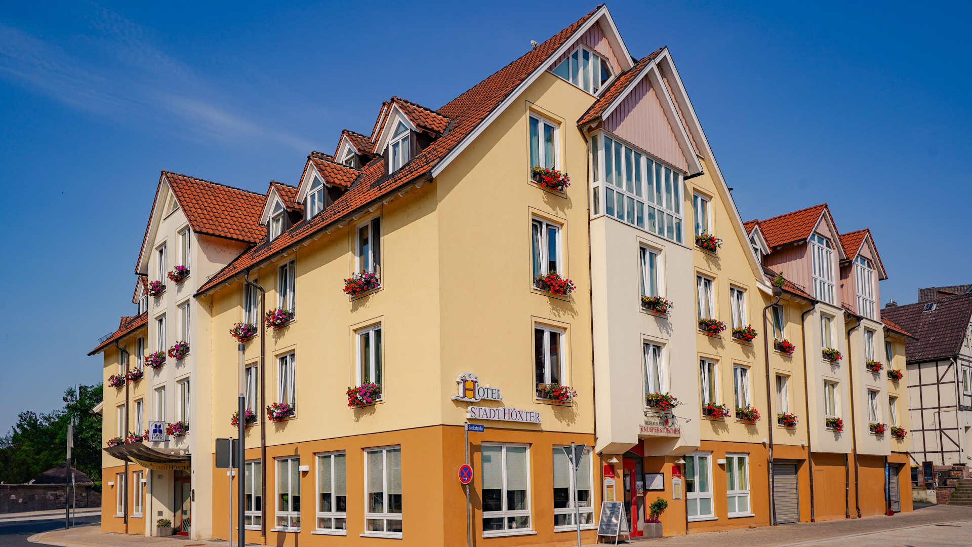 Herzlich willkommen in der Hänsel-und-Gretel-Stadt Höxter/Weser an der Deutschen Märchenstraße. Im Herzen der historischen Altstadt Höxters mit zahlreichen gut erhaltenen Fachwerkhäusern aus der Zeit der Weserrenaissance und direkt an den überregionalen Radwanderwegen R 1 und R 99 gelegen, bietet Ihnen unser Haus einen wunderschönen Blick über den Weserbogen bis hin zum Schloss Corvey und den Höhenzügen des Sollings. Es erwarten Sie moderne, komfortable Zimmer und eine herzliche Atmosphäre. Genießen Sie das märchenhafte Flair unseres Restaurant-Cafés „Knusperstübchen“.