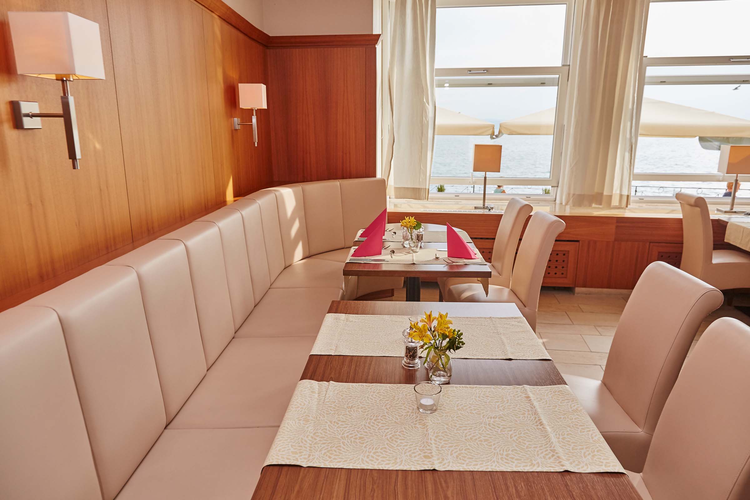 Im großzügigen Restaurant des Hauses sind durch die großen Panoramafenster der wunderschöne Bodensee und das Alpenpanorama zum Greifen nah. Sie genießen die grandiose Aussicht, das Team verwöhnt Sie mit kulinarischen Köstlichkeiten in einzigartiger Atmosphäre. Das Schiff-Küchenteam hat sich der saisonalen Frischeküche verschrieben und komponiert für Sie den Lauf der Jahreszeiten auf den Teller. In den warmen Monaten ist genießen Sie die lebhafte Atmosphäre der Uferpromenade auf der hauseigenen Terrasse, auf der in den Sommermonaten unzählige Besucher flanieren. Wenn es gegen Abend ruhiger wird, können Sie Ihren Urlaubstag bei einem gutem Glas Bodensee-Wein gemütlich ausklingen lassen.